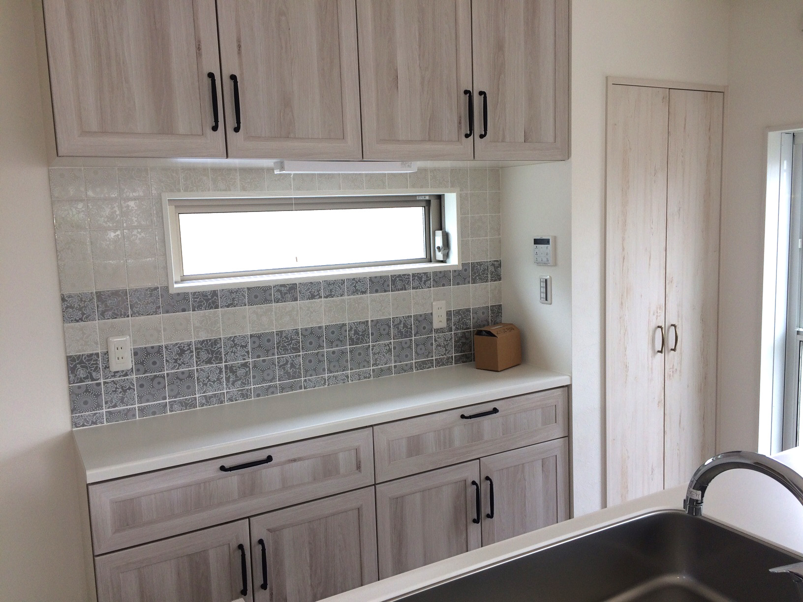 背面の収納部も標準仕様ですので、ご安心ください。お好きなタイルをお選びいただき、お客様が癒されるキッチン空間にいたします。