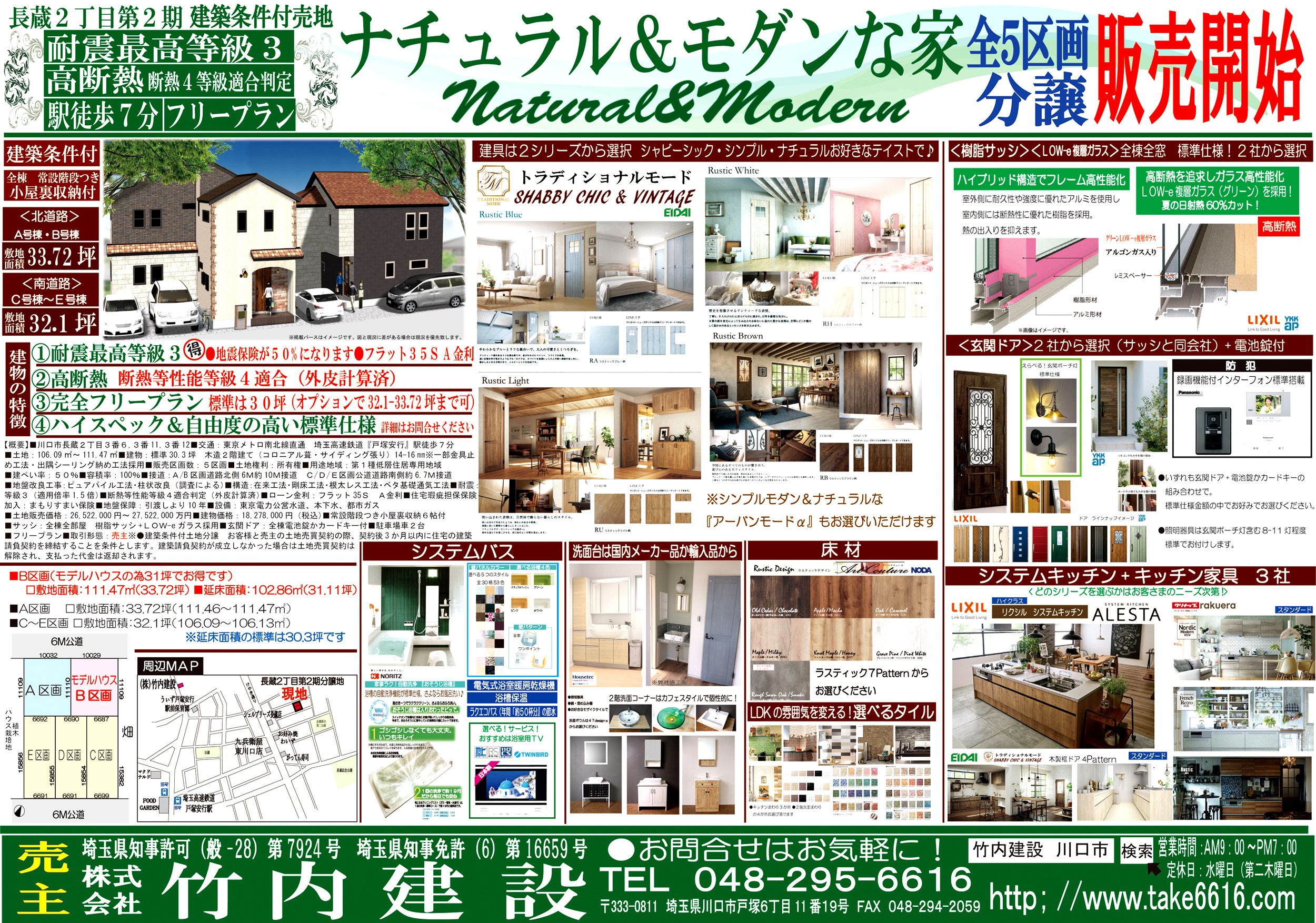 ◇所在;川口市長蔵2丁目3番6、3番11、3番12 ◇交通1;東京メトロ南北線直通埼玉高速鉄道『戸塚安行』駅徒歩7分 ◇土地;106.09u〜111.47u 32.1坪〜33.72坪 ◇建物;標準仕様は 30坪 ◇建ぺい率;50% ◇容積率;100% ◇販売戸数;全5区画 ◇土地権利;所有権 ◇用途地域;第一種低層住居専用地域 ◇地盤改良工事;ピュアパイル工法か柱状改良(調査による) ◇構造;在来工法 ・剛床工法・根太レス工法・ベタ基礎通気工法 ◇耐震等級;等級3(適用倍率1.5倍) ◇ローン金利;フラット35S A金利 ※地震保険50%割引 ◇住宅瑕疵担保保険加入;まもりすまい保険 ◇地盤保障付(引渡より10年) ◇全棟 常設階段つき小屋裏収納 付 ◇設備;東京電力,公営水道,本下水,都市ガス ■主要な仕様:○全窓:樹脂サッシ+Low-Eガラス(複層断熱ガラス)○床断熱材:旭化成ジュピー(世界最高水準の断熱性)採用他 ●断熱等性能等級4適合判定(外皮計算済) ○システムキッチン+キッチン家具;お客様のニーズによって3社から選択可 ○おそうじ浴槽(浴槽自動洗浄機能付) ○2階に洗面コーナー付(モザイクタイル等使用のカフェスタイル)○床材:ラスティックな7色から選択○洗面台は、国内メーカー品(サイド棚付)か輸入品(棚は付きません)から選択可○えらべるタイル3-4か所でお好きなテイストに♪ ■住環境良好:人気エリア『長蔵2丁目』駅まで徒歩7分 ■全5区画 ★北道路 2区画 南道路 3区画★ ☆弊社社員が無料でプラン(4回〜6回標準)・仕様選定お打合せ行います ☆外構工事費・地盤改良杭工事費 すべて込み ◇取引態様;売主 |